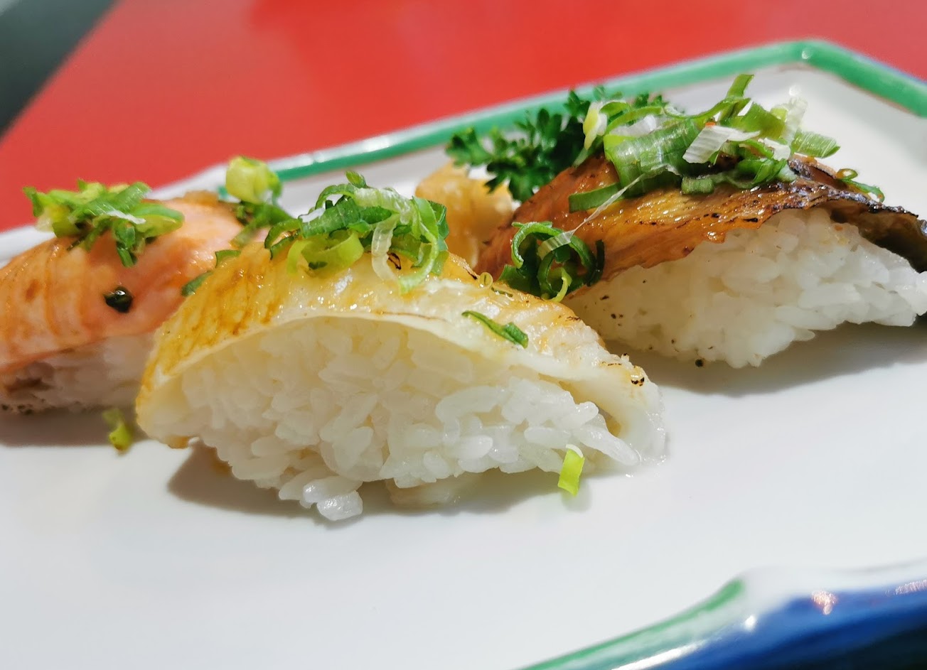 不知道是否節日客人太多,壽司上面有半熟生魚片的一道菜,因為節日套餐的菜有蠻多道,吃得不夠快,店家沒有逐桌控制出菜,讓這盤壽司出菜後擺不下桌面而拿回廚房。但是,再看到這道菜時,怎麼感覺是製作一段時間的壽司?半熟生魚片看起來也是乾乾的感覺?