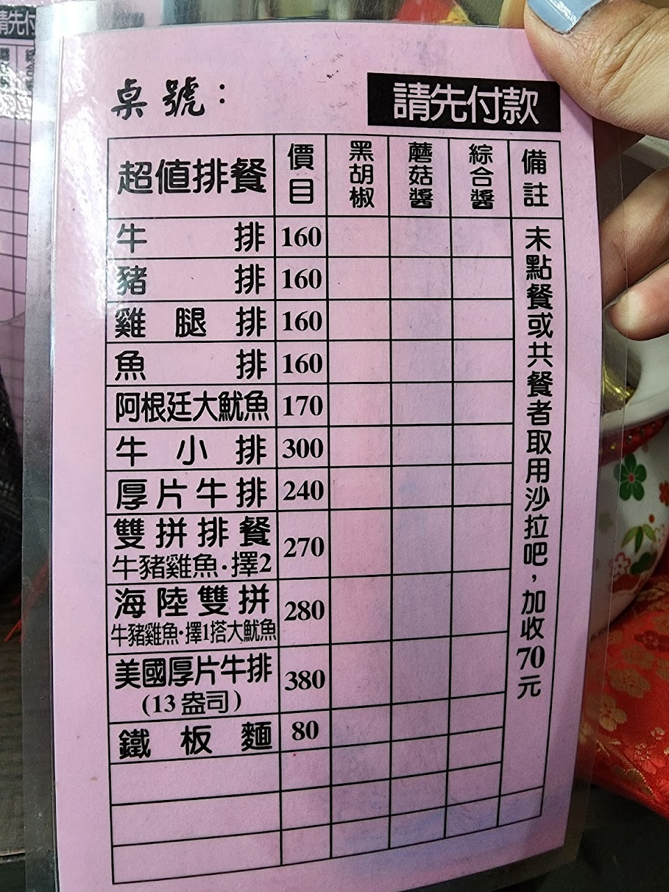 台式平價牛排店,價格便宜,有小型沙拉吧跟飲料提供,沒什麼裝潢,就是日常飲食。