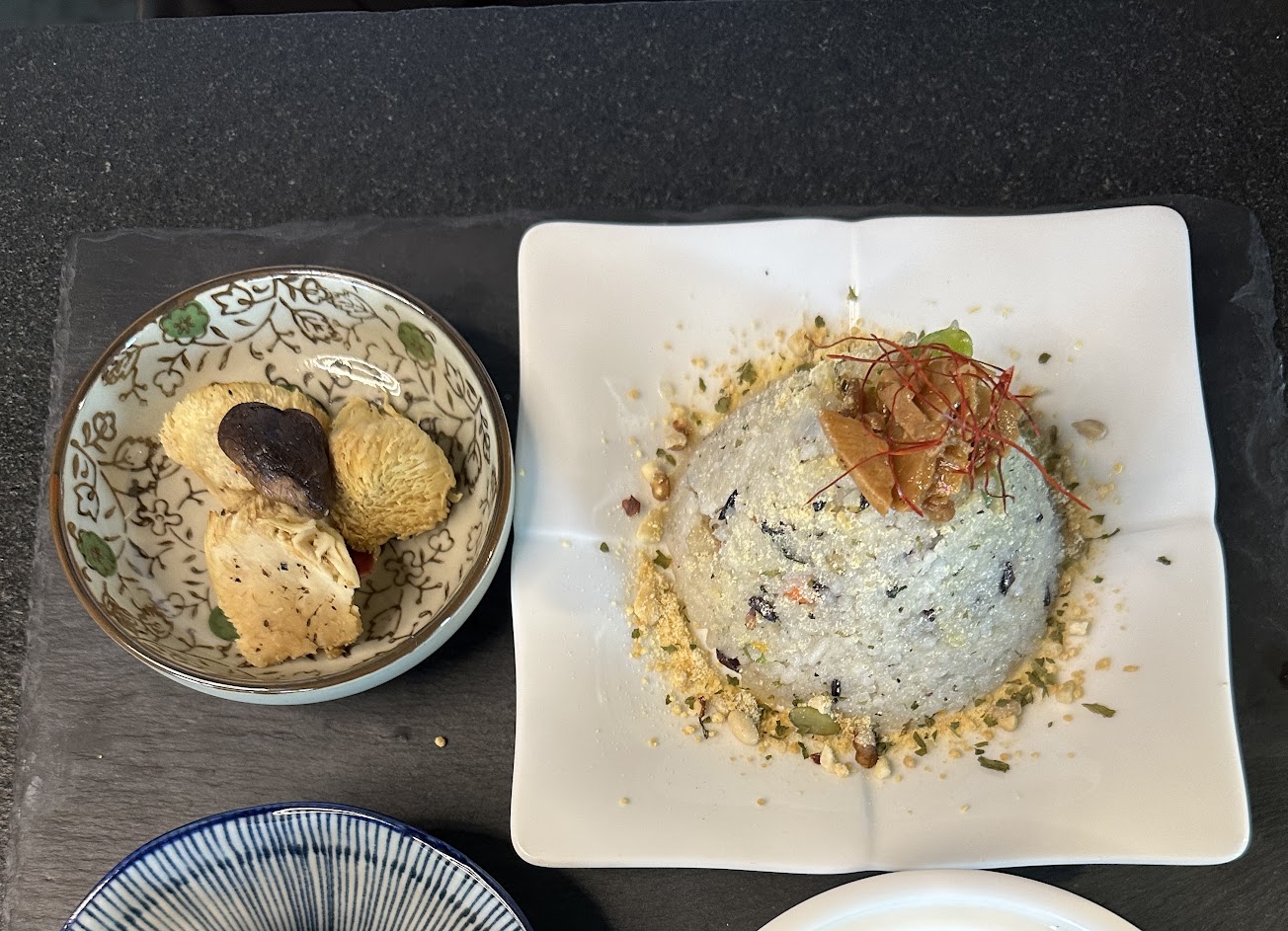 附餐有哇沙米和沙西米的味道,雖然是蔬食但生魚片做得非常像,黃瓜會有哇沙米的味道,菇應該是松露(?),味道很香,也建議一口氣咬下以免浪費菇裡頭的汁。