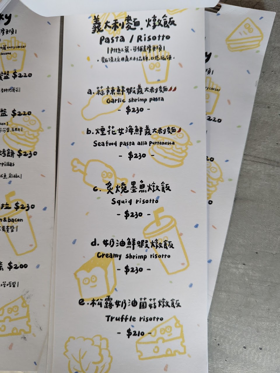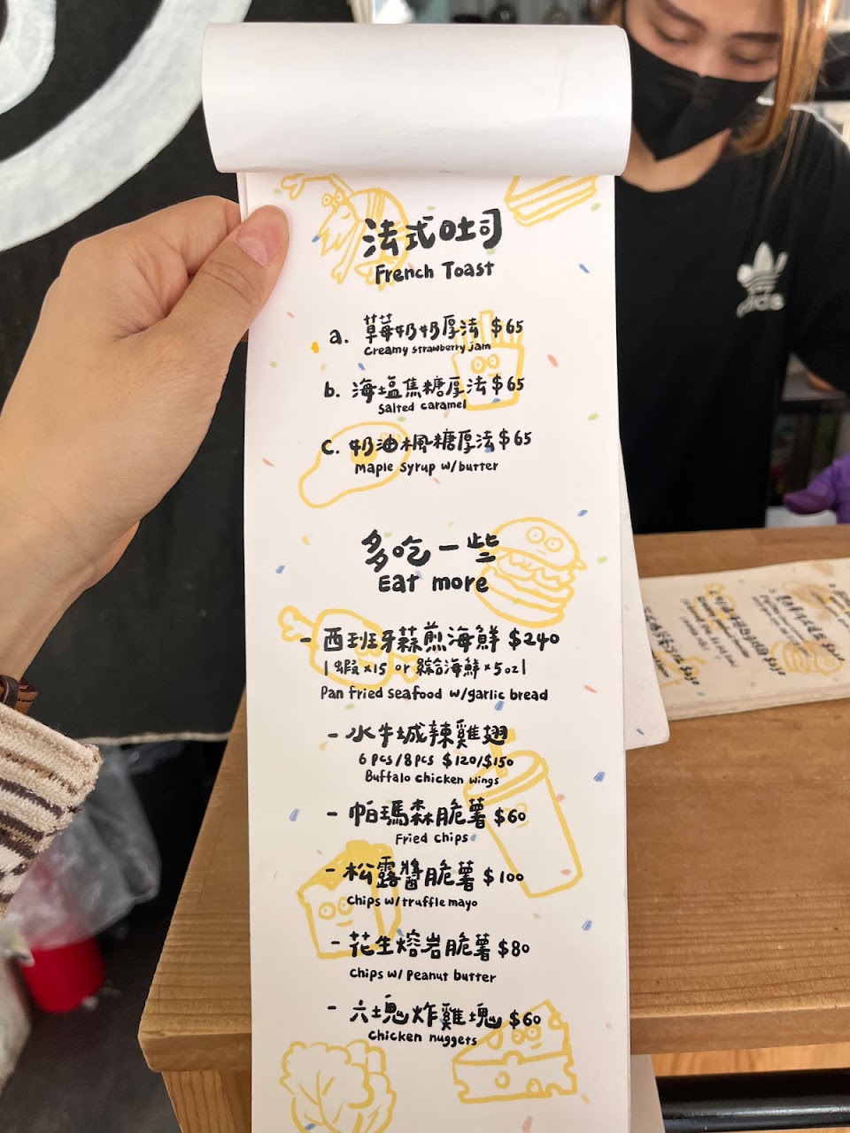 超蝦早餐盤, 焦糖瑪奇朵 小白咖啡 熱, 蝦爆拼盤, 北非茄汁燉蛋, 厚法客吐司 草莓奶奶厚法, 醺鮭魚沙拉, 蝦爆分享盤, 松露奶油菌菇燉飯, 蒜味麵包, 焦糖海鹽厚片, 英式炸魚薯條