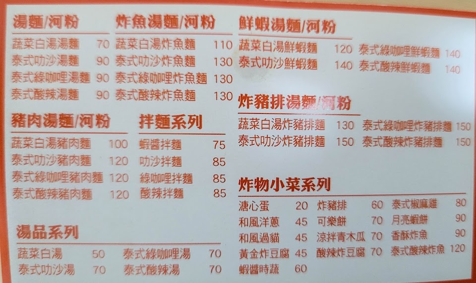 不吃辣,沒能體會他的泰式風味,不過以不辣的蔬菜湯底來說,不管是拉麵或是河粉還不錯吃…不講究氣氛的話,一家子吃午、晚餐還蠻合適。(沒拍照)