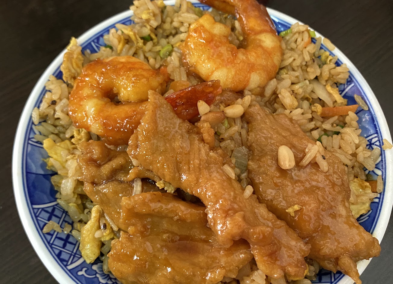 蝦仁炒飯現炒,炒飯飯體粒粒分明不會黏在一起,是品質好的炒飯,蝦子炸後淋上醬汁嚐起來有種日式風味。