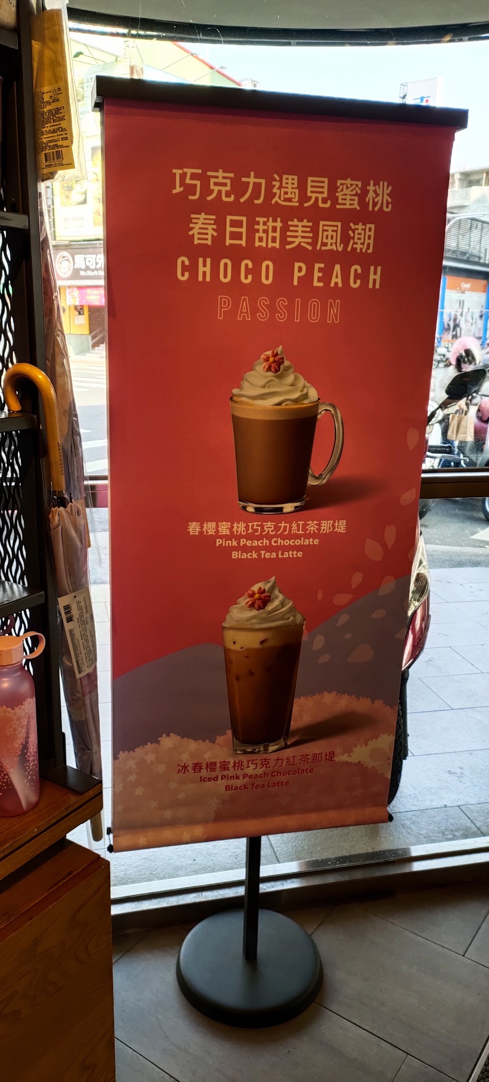 熱拿鐵, 巧克力可可碎片星冰樂 去奶油, 水蜜桃白巧克力星冰樂, 巧克力可可碎片星奶冰樂 去奶油