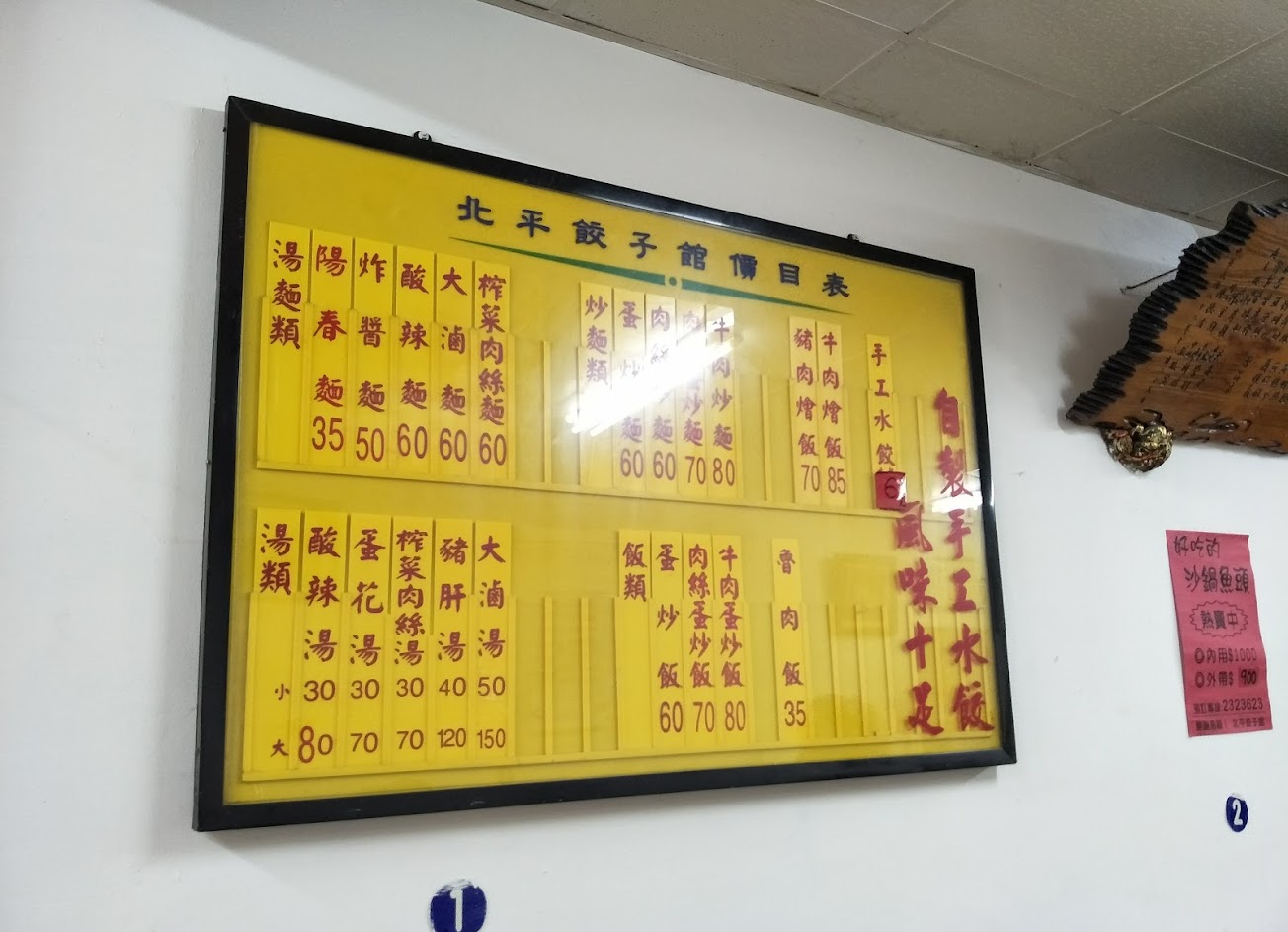 北平餃子館生意頗佳,屬重口味,推薦牛肉炒麵、炒飯、水餃及酸辣湯,尤其酸辣湯由酸白菜入味具特色,份量飽足,還有多樣可口小菜,老闆娘笑臉服務,用餐都開心。