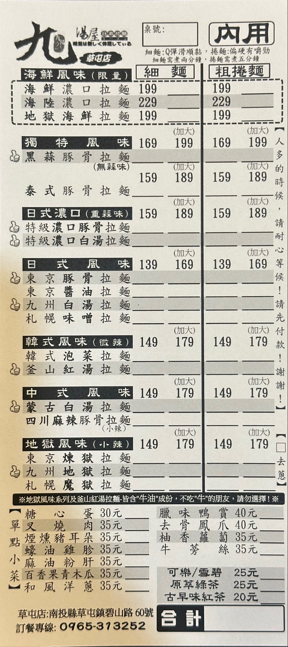 相對於草屯其他的拉麵店來說,九湯屋算是不錯的選擇。細麵吸附湯汁的能力強,粗麵條有嚼勁。同時營業時間也比較晚,晚進食的人的好選擇。