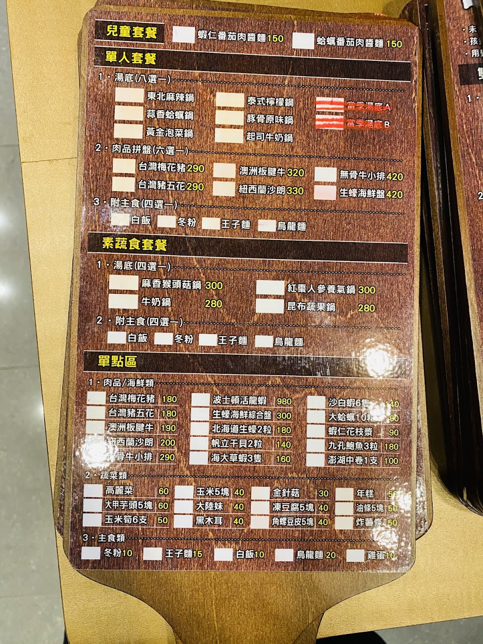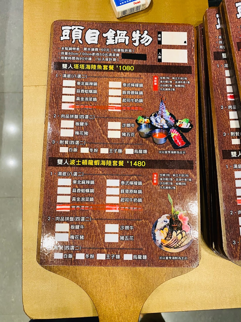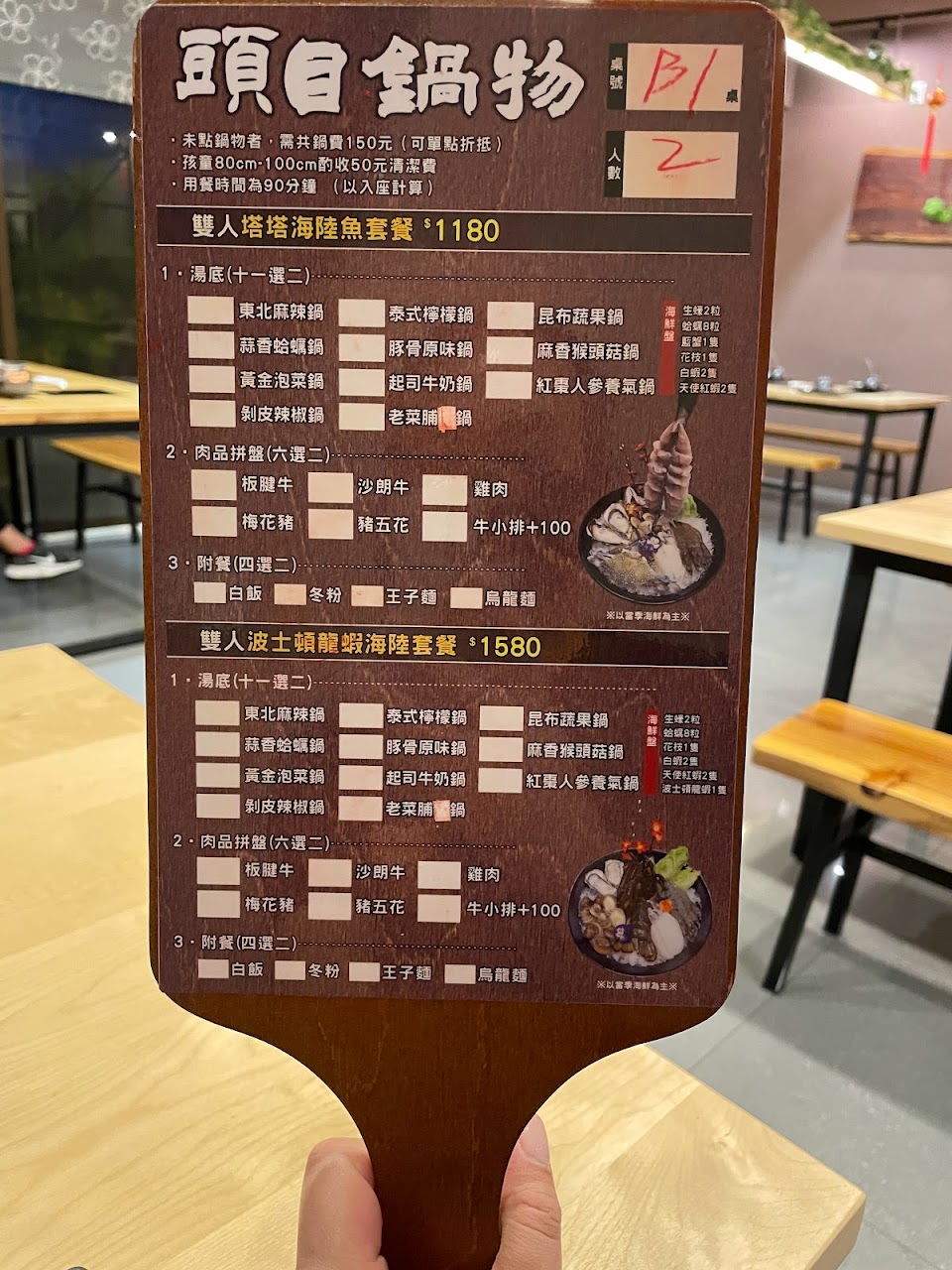 菜單上只有寫未點鍋者需付共鍋費,沒有寫一桌只能一個人共鍋,標示不清楚,我們都畫完單去結帳才說,差評
