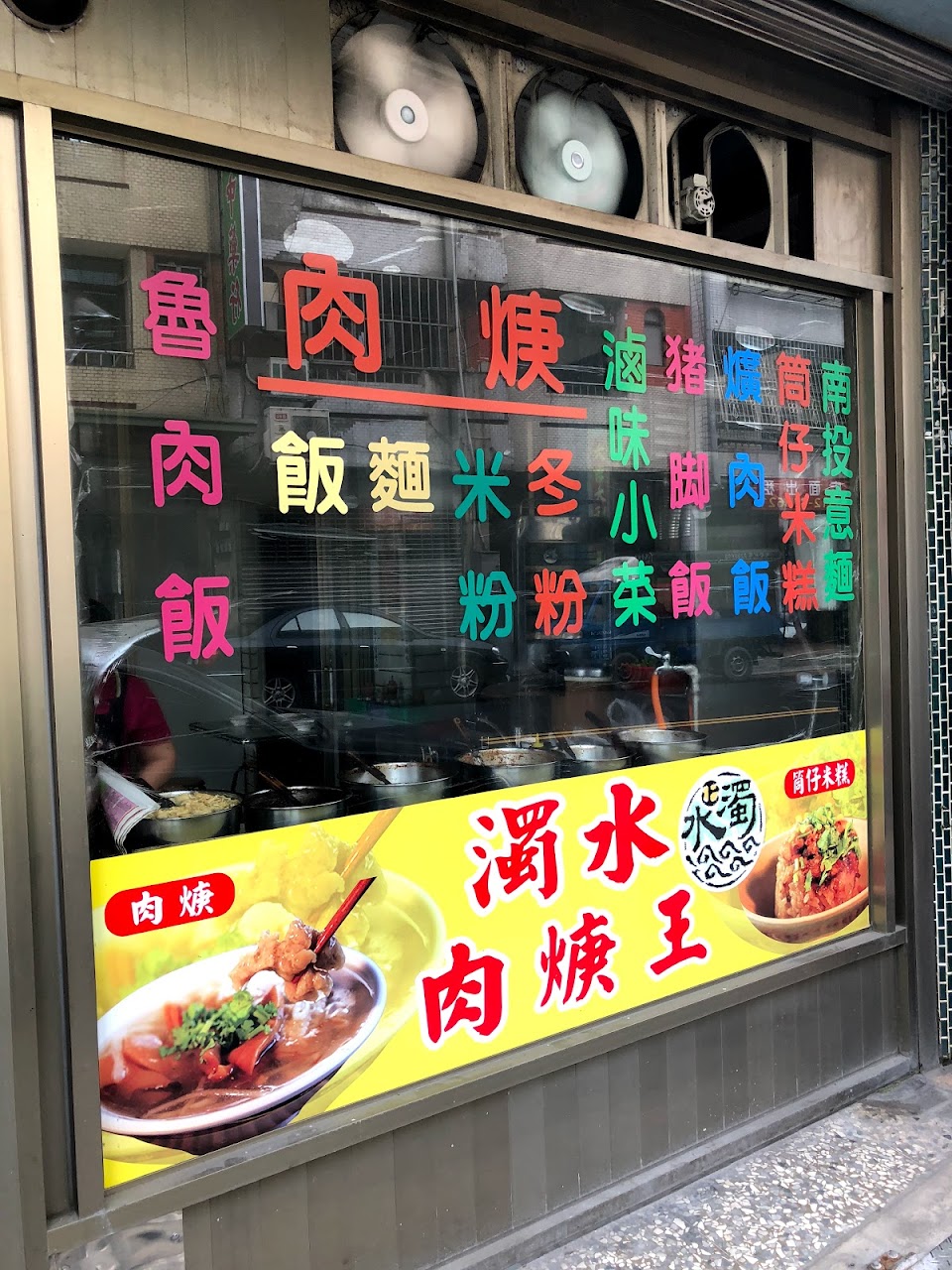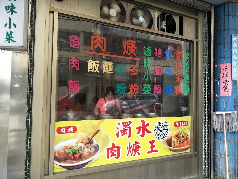 「濁水肉焿王」位於濁水火車站前的十字路口處,店內招牌是肉羹以及筒仔米糕,另有多種飯麵及各式小菜。