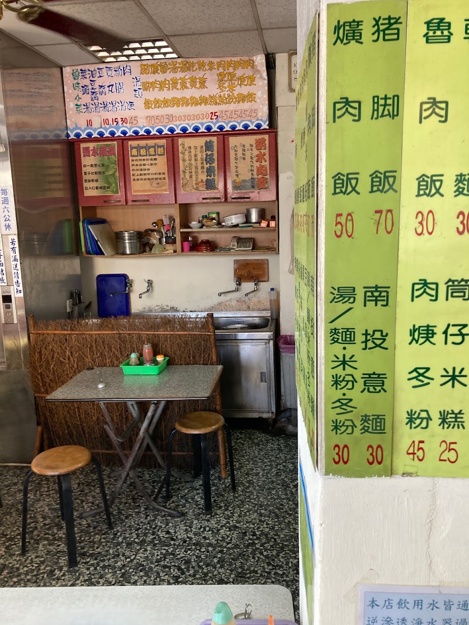 對面有濁水火車站停車場可以停車,小鎮上數十年的老店,價位夠便宜,食材夠新鮮。現在有空調。水生空心菜是名間特產,梗粗葉大夠嫩,米糕和白飯的米也是濁水米,濁水溪中上游的米比較起來氣味更好。爌肉和豬腳吃起來和自己滷的差不多,有滷透但是瘦肉發乾有點硬,滷汁要再加強才有職業水準。這次沒有點招牌上的肉羹,附近七八家店家都在賣肉羹,下次好好比較一番。