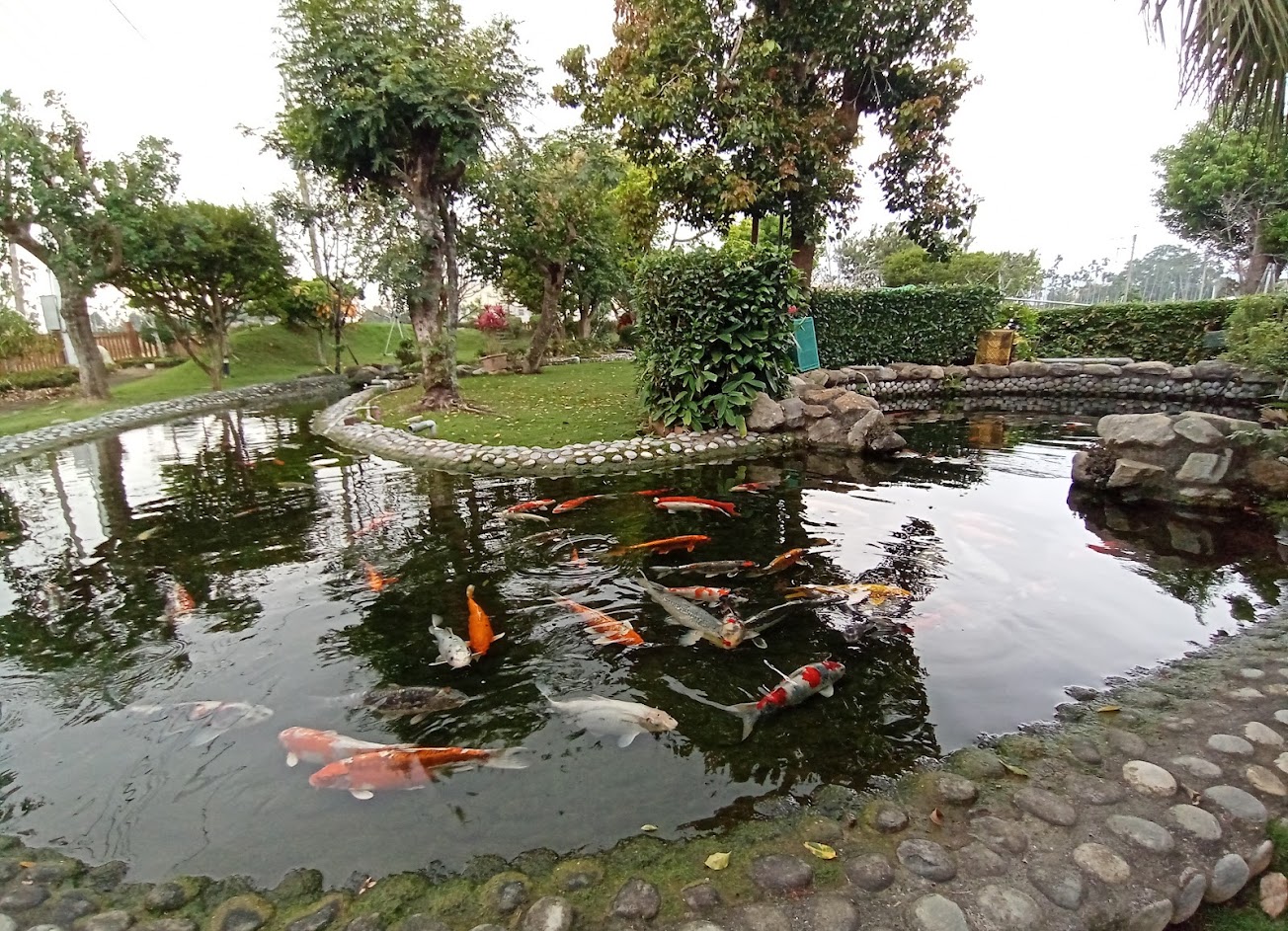 大人可以在裡面吃下午茶,小孩可以在外面奔跑、餵魚