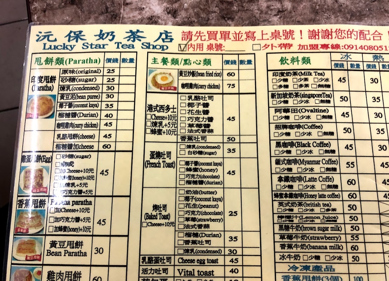 This is an authentic coffee/ tea shop off Little Burma Street in Taipei. Offering outdoor and indoor seating, it is a typical stand for all generations to enjoy a cuppa Joe. It was about 75 nt for a condensed milk paratha and cold milk tea. My friends got chocolate banana paratha and kaya paratha which was also really yummy.