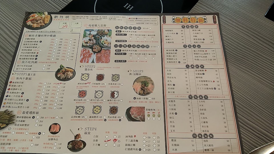 我的菜盤蛤蜊是壞掉的,上桌就已經開了,並不是肉眼難見到的腐壞;唯一一片大陸妹也爛爛黑黑的,真的不知道廚房怎麼出菜的,這種菜盤怎麼還送到客人桌上呢?一顆星給服務的弟弟,私下跟他說後,拿回廚房補了三顆好的蛤蜊。 我的絲瓜是老到跟菜瓜布一樣的,同行友人的絲瓜是壞掉的,整片都是黃色的,然後我們的紅蘿蔔都是氾黑的。真的不知道到底去哪裡收集這樣早已腐敗的食材來充當菜盤,這火鍋價格並不算平價,萬一吃出事情怎麼辦呢?真的是很糟糕的體驗! 羊肩肉沒什麼羊肉味,而且很硬,以為上的是豬肉,但後來吃一吃隱約覺得有吃到羊肉味道(吧?),就沒有反映。 然後醬油超鹹。 單點的魚卵花枝漿不錯吃,但只是在花枝漿上鋪了一些魚卵。沒有拌進去,客人下鍋的時候就全散了,只是噱頭,不需要花68元加點真的。 服務人員把鍋送上桌的時候也都沒有教導顧客如何使用IH爐,或幫顧客確認爐子是否能正常運作。 我的爐子始終都有亮燈,所以我以為是正常運作的,直到同行友人的剝皮辣椒鍋都滾了,我的始終如一汪清水,請服務員來看才說當機了,重新插拔插頭——重點這間火鍋店用餐只有70分鐘,幫我換菜盤跟爐子前後花了非常多時間。 另外,結帳時看到當日消費滿800元可以到一樓借問站換奶酪,但借問站17點就關了,櫃檯都沒有說欸……。