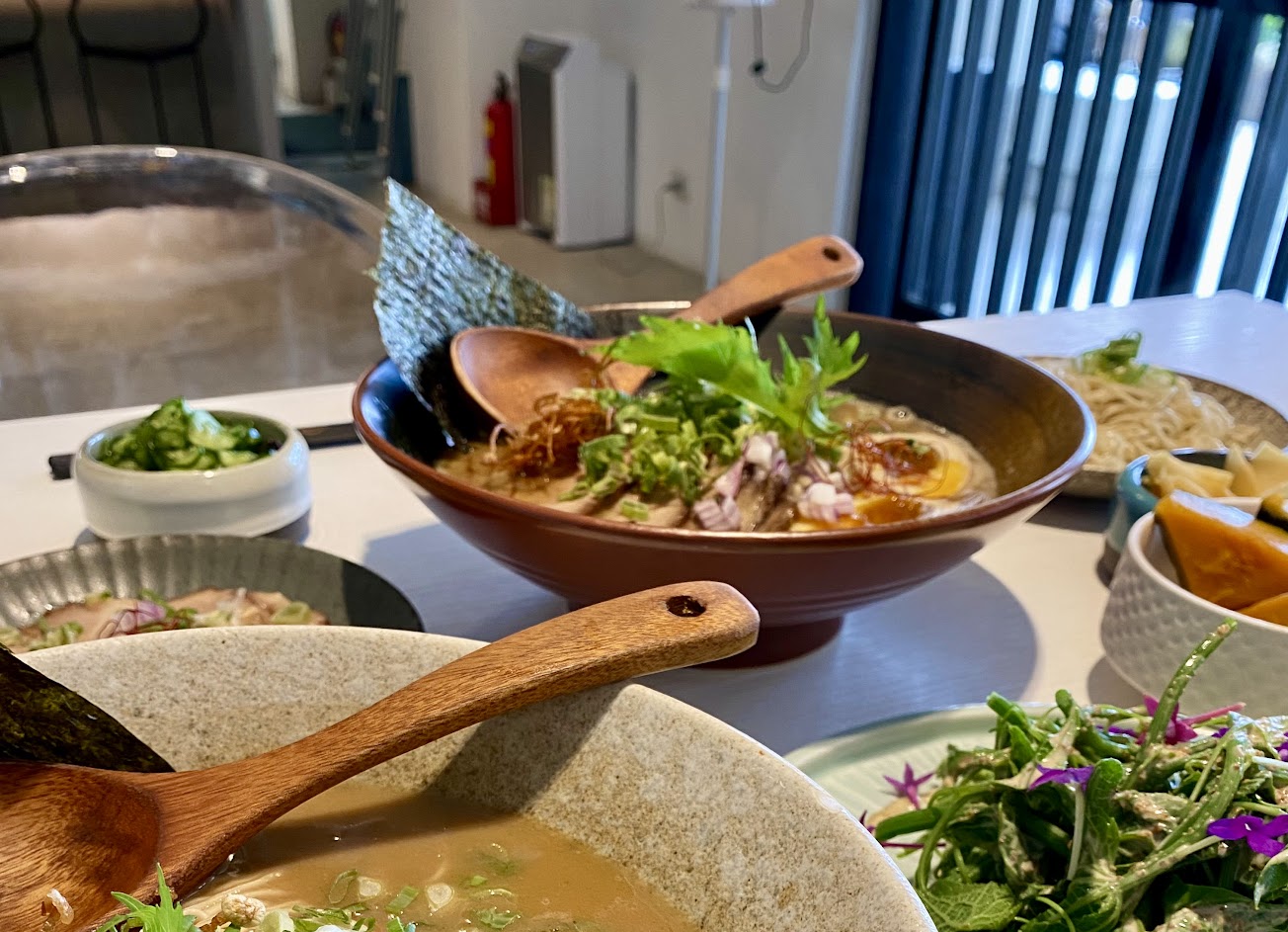 來日月潭不想吃合菜,看地圖搜尋到這家,打電話過去告知我們最後點餐時間pm7:15,所以立刻開車過去,地點較偏僻,車子可以停外面馬路路邊,外面馬路沒什麼路燈,黑漆漆的有點可怕?,但是一進去看到裡面的景觀非常美麗,庭園建築很有特色,夜晚燈光襯托建築夜晚的美,餐廳樓上是民宿,餐廳裡面走純白設計風格,廚房採開放式設計,感覺乾淨衛生,拉麵菜單採QRCODE掃描,但點餐要請服務人員親點,拉麵呈現日本道地口味呈現,湯頭偏鹹可以減鹽,各式小菜擺盤精緻,鱈魚肝口味清爽不腥,唐揚雞酥脆不油膩(感覺是醬油口味),拉麵份量頗多,用餐要再加一成服務費,價位偏高,來日月潭旅遊想換換口味,喜歡特殊餐廳設計風格的人可以來嚐鮮。