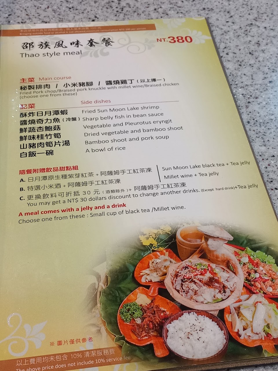 含附餐紅茶(小米酒)+茶凍,以觀光景點價位來說可接受了,有收服務費,但邵族特餐真的不行,雞丁有骨頭,出現泡菜是…?火鍋套餐尚可接受,也可2人點一個餐點,這點給星!