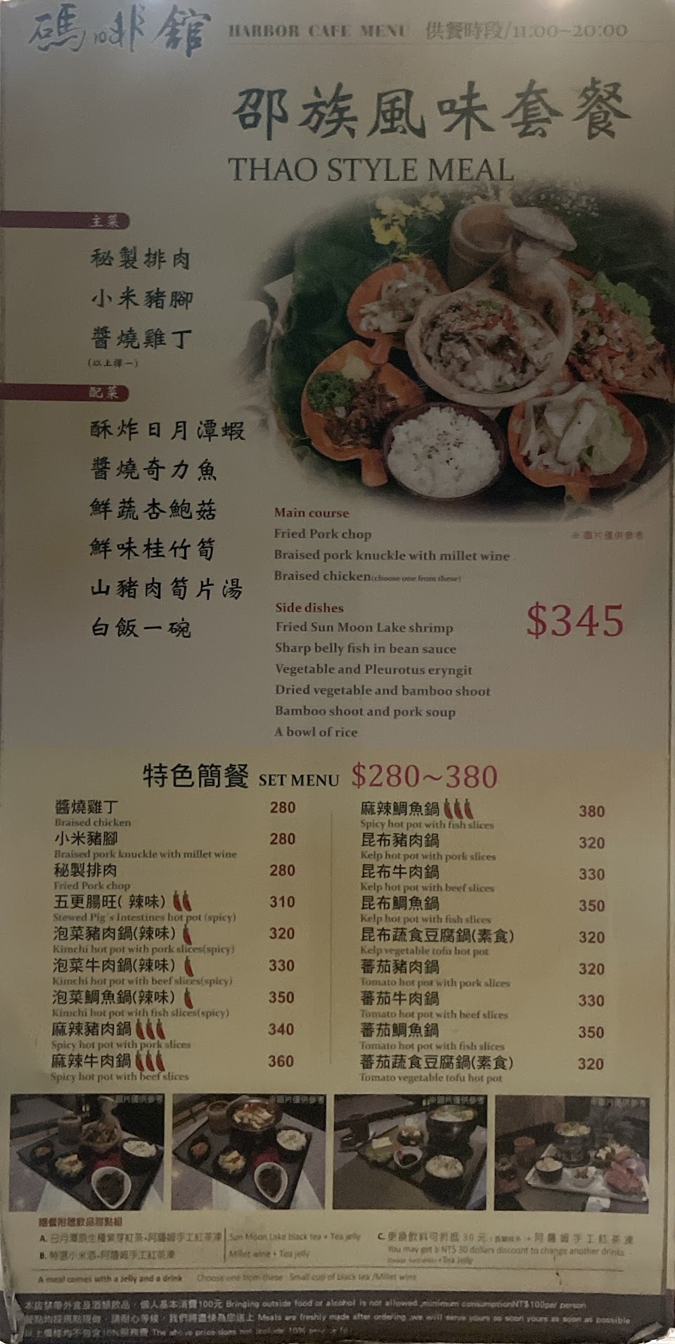 店名取得有一點邪惡,但卻很貼切“有碼頭,有咖啡,有點心,有冷熱飲,有調酒,有簡餐,有特色餐……”,收費算很平價,也有刷卡服務,而且沒有低消,重點是還不錯吃! 這兒的用餐區域除了一樓,有地下室,還有室外座位區,但不管是在哪一區用餐或是休憩,全都是有一大片落地窗且面對日月潭碼頭,可一邊用餐一邊欣賞潭邊風光,這裡的餐點配菜種類豐盛,每一樣配菜的份量都不多,若以一個男生的食量來說應該差不多,但如果是女生可能就會“有餘”,個人覺得這裡是很適合2~4人一同用餐的場所,如果您是第一次來此自助旅行遊玩的朋友,而且搞不定用餐場所的話,或許“碼啡館”是一個不錯的參考選擇。