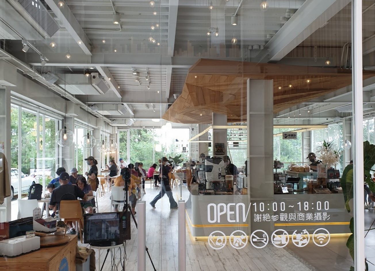 白色的鐵皮建物搭配多變的木質裝飾,店內大面積玻璃落地窗,採光非常好,左邊的座位區風景會比較優美