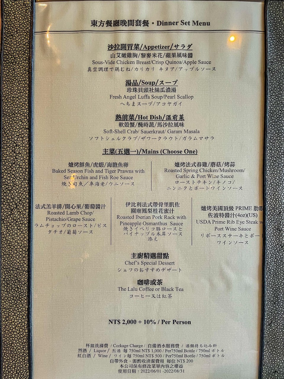 東方餐廳是五星級飯店,涵碧樓的下午茶餐廳,餐點主食選擇性以肉類居多,海鮮類少一點。兩點一進去,肉類竟然沒有熱,只有溫溫的。只有炸蝦才是熱騰騰的,炸蝦是餐點中我覺得最棒的,香酥好吃,連殼我都吃了。中式餐點有燒麥包子,種類也還好。還有生魚片五六種,與手卷。生魚片沒有保冰措施,有點軟軟爛爛的。生菜沙拉一定不可少,蛋糕甜點約十種,口味普通。冰淇淋說是手工製作。與之前到訪同樣五星的隔壁飯店比較,整體來說,原本期待驚艷感覺,一點也沒有,與坊間大型下午茶差異不大,只能說不難吃但是沒有驚艷感,C/P值不高。所以我就沒拍餐點了。