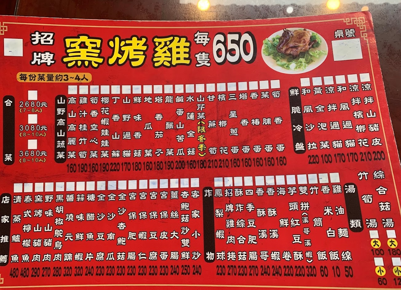 窯烤雞香而不膩,應該是老闆獨門配方,個人覺得味道大勝其他知名連鎖店! 每次去溪頭旅遊的必吃美食👍🏻 服務 內用 餐點類型 午餐 平均每人消費金額 $1-200 餐點:5 服務:5 氣氛:5 建議的餐點 檳榔心煎蛋, 窯烤雞 涼拌山豬皮 炒山芹菜 竹筍湯, 山竹筍 半天花, 阿東甕缸雞, 炒檳榔花 炒山苦瓜 宮保大腸頭 炒山蘇 竹筍湯 停車位 很多停車位 附近的停車場 免費停車場