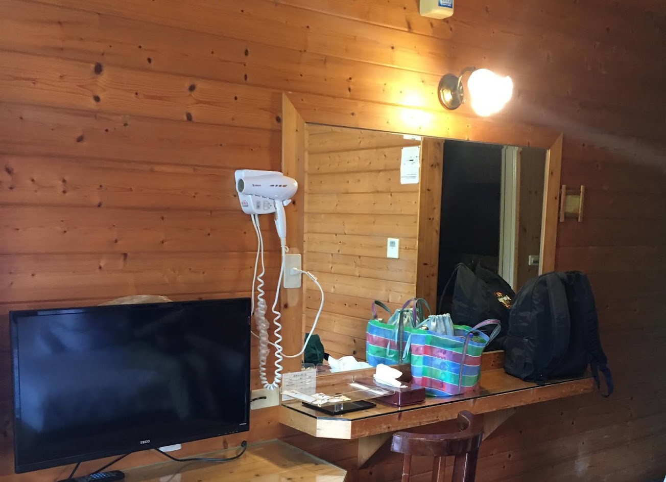 認真的原木民宿,眼睛所及都是木頭色,內裝感覺的出有些年代,但是維護的很不錯。房間乾淨寬敞,有很多檯面可以放東西(這個大讚),要開兩個大行李箱也綽綽有餘。員工親切服務很好,停車位很多,還有小花園,我們找到優惠套券,非常划算!