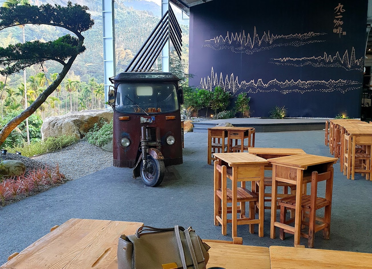 館內佈置別具一格,九份二山與糯米橋意象,檜木等原木桌搭配龜甲石花器。館外充滿層次美感的園藝造景,還有讓人懷念的課桌椅,舊穀倉蒐藏農業社會難得一見農機具,如同坐上多啦A夢時光機回到農業時代。點杯九二咖啡坐在原木桌上品嚐 舒壓,值得愛喝咖啡及愛好收藏者來此一遊。