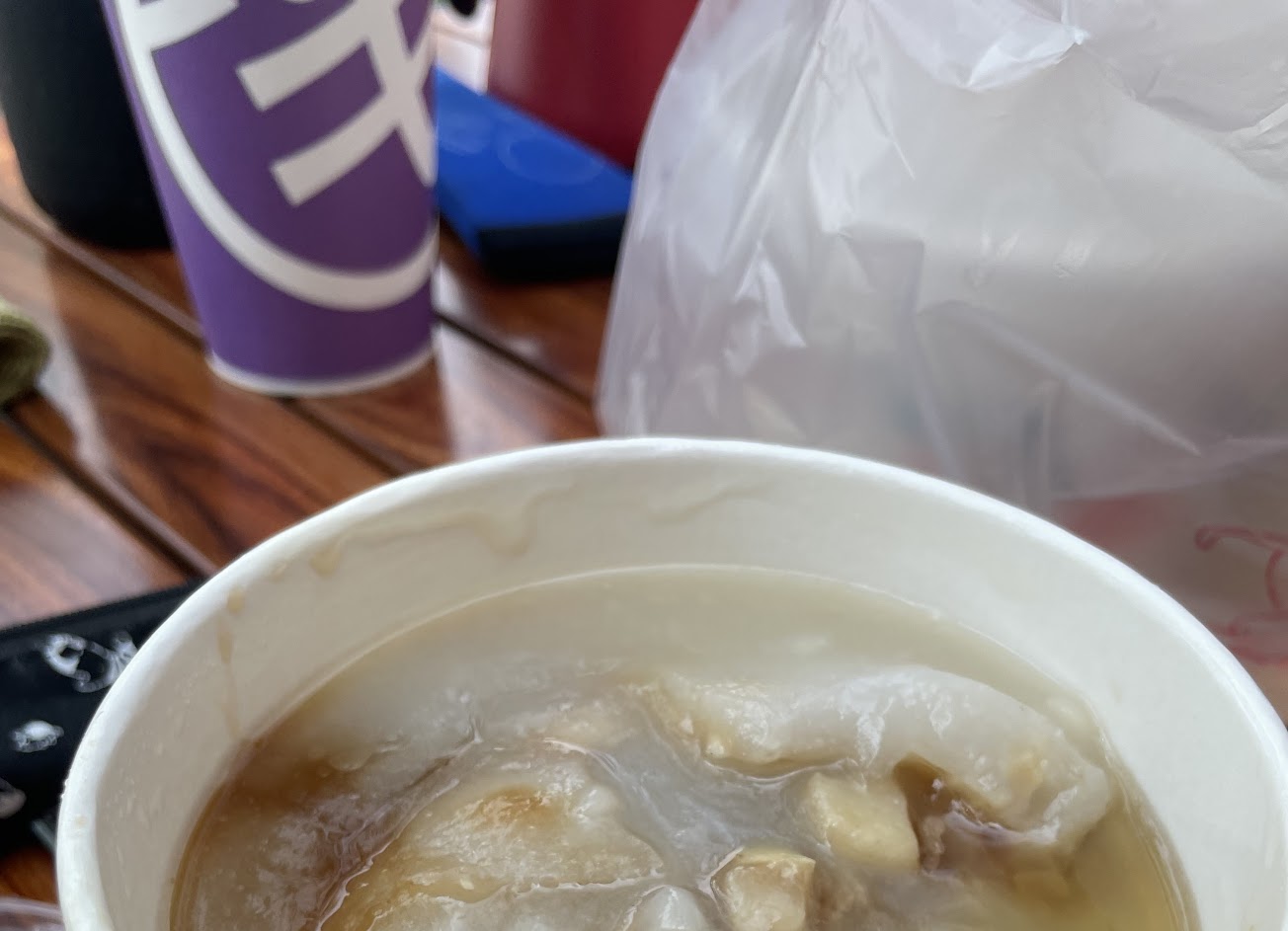 來外帶肉圓,皮q醬料有醬油,滿特別的。吃到後面有點膩,太油。綜合湯很清淡不錯。營業時間比較長,對水里肉圓有興趣的可以試試