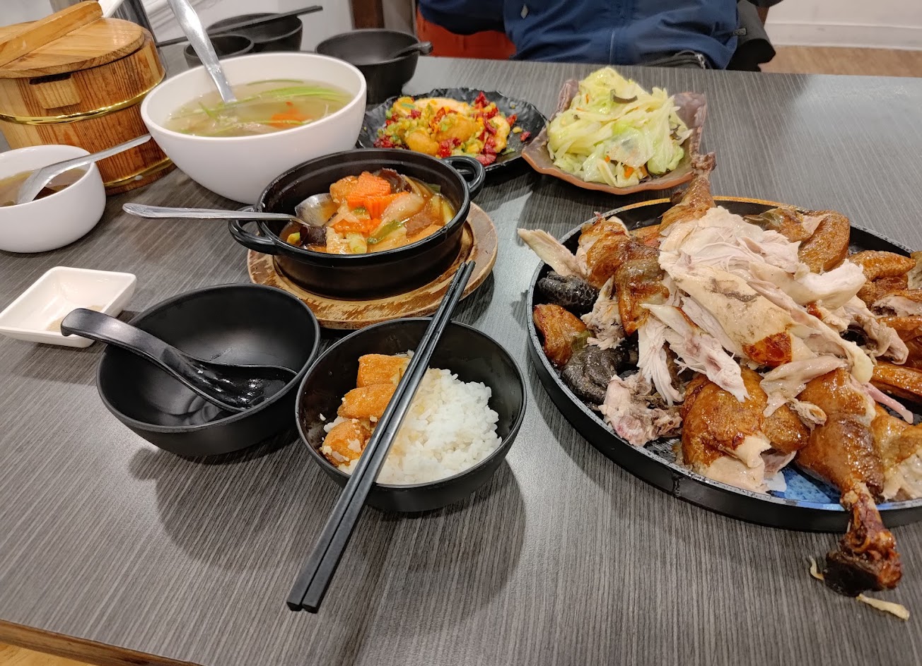 – 烤雞:4.8星,有專人剝雞,非常專業,且排的很漂亮!雞皮非常好吃,跟別家的甕仔雞不同 – 炒高麗菜:4.5星,好吃 – 紅燒豆腐:4.5星,豆腐很嫩,裡面還有汁 – 金沙美人腿:4星 – 湯:3.8星,普通,覺得太冷可請店家再熱過