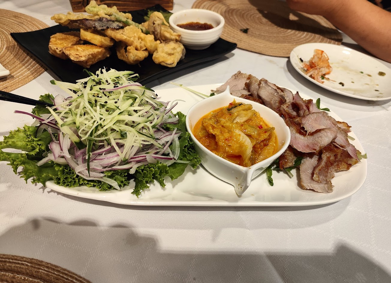 晚餐很有誠意不是熱炒店菜色,清蒸檸檬魚、綜合蔬菜天婦羅、海鮮咖喱、卦菜雞湯全都美味份量依照人數配置,飯後水果甜點都一應俱全,早餐簡單清爽中西式都有,人多時需耐心等候