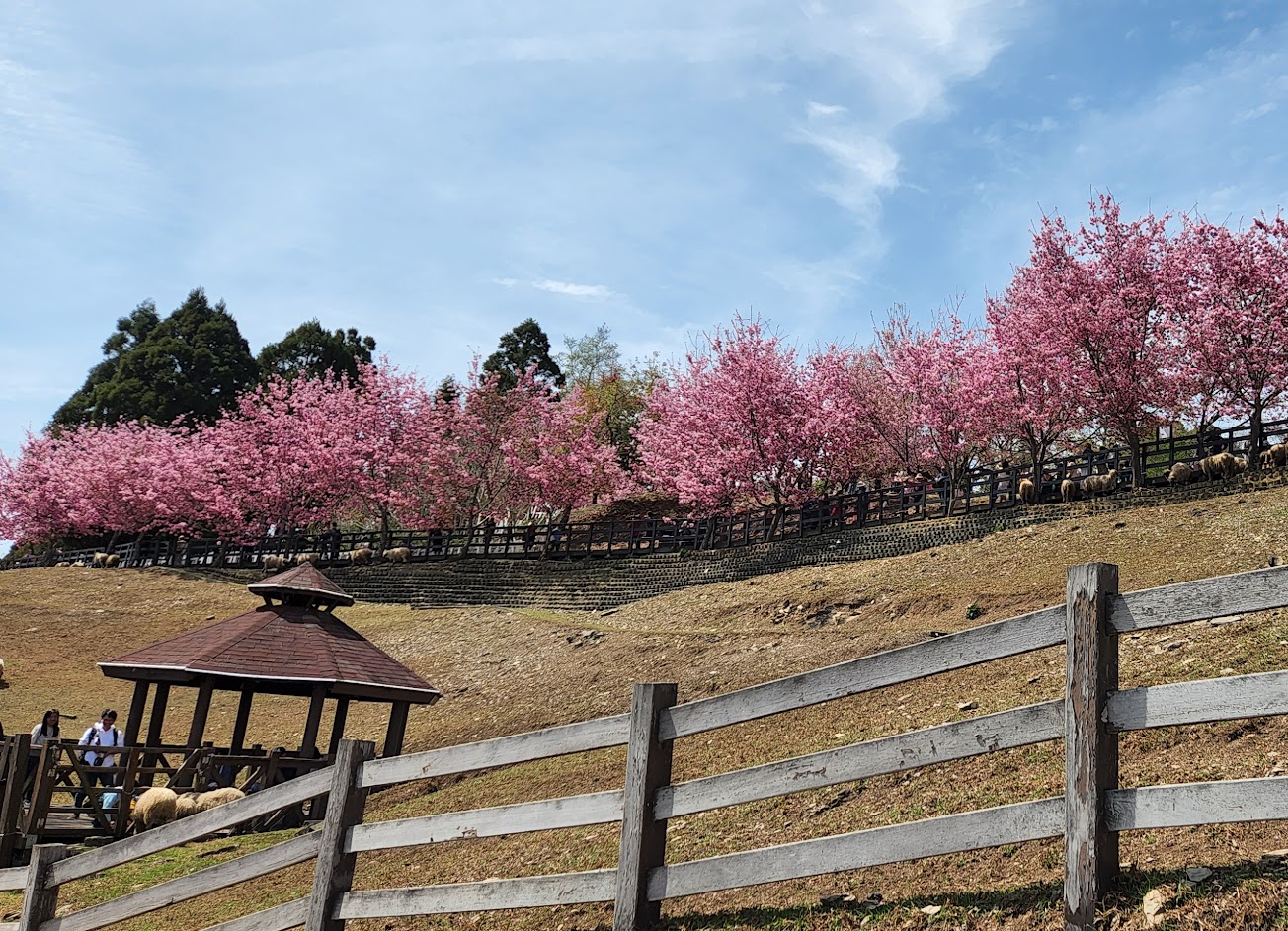 櫻花盛開不管哪一個角度都很好拍,真的非常美!還能跟羊群互動餵食!我都會玩到不想回家!但如果說是來賞櫻的,建議平日早上8:00就入園,否則越晚越多人~