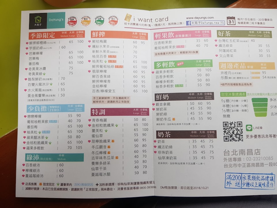 店門口不定時會貼出當天的優惠活動。另外在中國信託提款機目前也可以找到優惠券哦,提款機操作到最後,可選擇「明細+coupon券」,再選擇「中信精選」,再選擇「咖啡飲品」,就可以看到大苑子的活動,目前是二杯莓好時光129元,省31元,活動到2020年1月31日,若有喜歡喝的,可以多少拿點折扣還挺不錯的喲。
