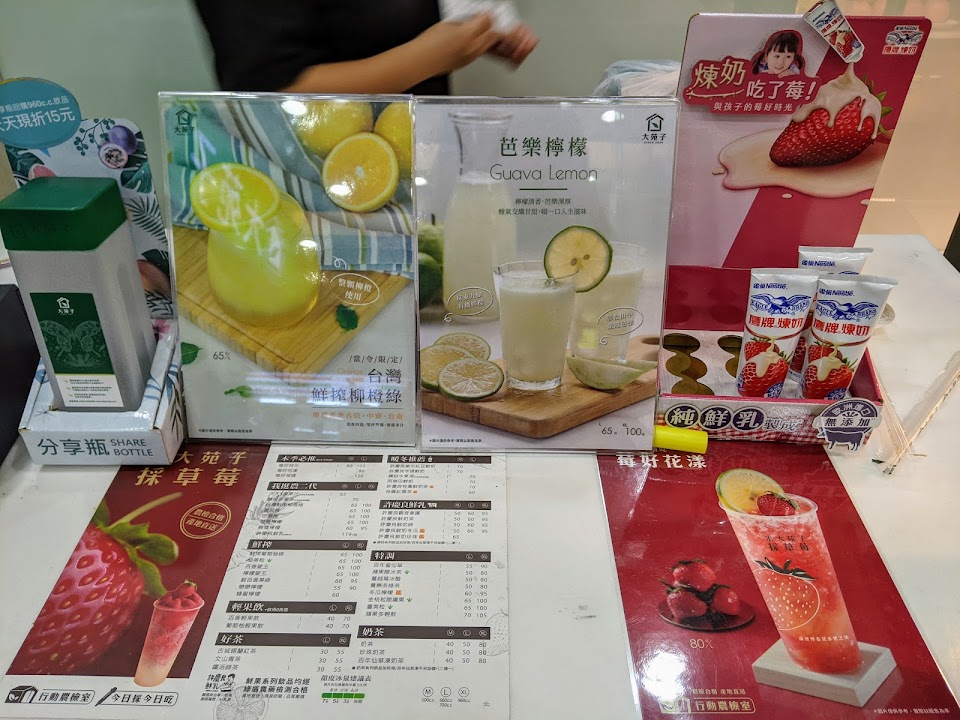 大苑子是以水果為基礎的調和飲料,比如果汁和茶,果汁和奶,或兩種果汁的調和,櫃台前常有試喝產品,最喜歡夏天的芒果冰沙和冬天的莓好時光,莓好時光是草莓牛奶,現在大苑子的牛奶採用許慶良牧場的鮮奶,喝起來挺香醇的,莓好時光也喝得到一些草莓果粒。