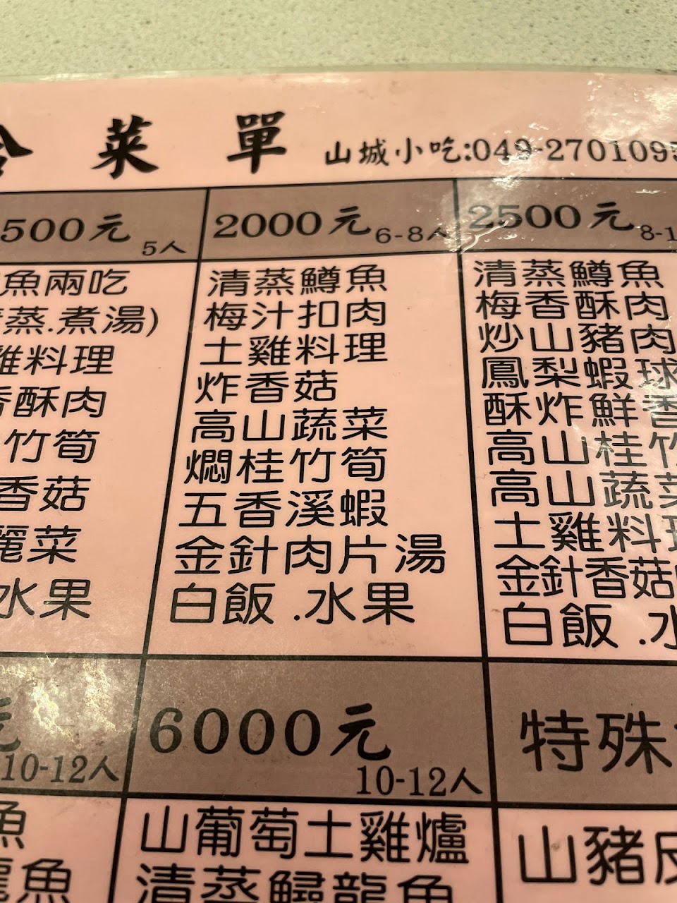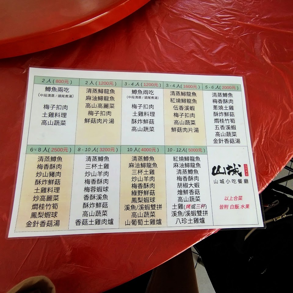 東埔非常推薦來吃的餐廳-山城小吃,皆為合菜(如菜單),我們是2個人,點700元套餐,鱒魚是一隻活的料理成二吃,梅子扣肉中梅乾味道很重口味扣肉則較清淡,搭配起來很下飯,鱒魚二吃清蒸及酸菜魚湯都味美,絕對令人驚豔