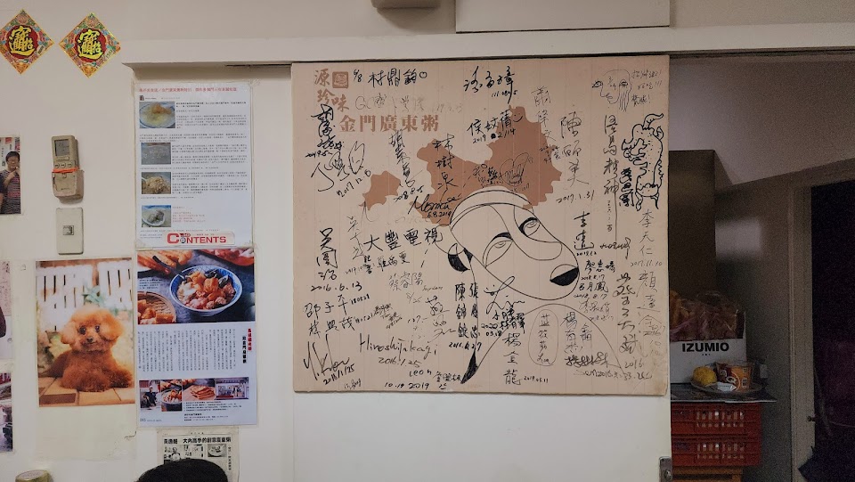 這家位於 中和景安捷運站附近的 源珍味金門廣東粥店 是在中和區非常人氣又知名的 金門廣東粥店! 店內空間不大 包含店外約有5~6張桌子 店家內的牆上有許多知名影星 球星與政界人士的簽名!!由此可見店家的名氣!這裡除了金門傳統口味的粥品 還有常見的 皮蛋瘦肉粥 雞肉粥 魚片粥等等 有很多種選項!口味道地 用料實在 到了用餐時間 排隊人潮不斷! 老闆不因有名氣! 就擺架子 有問必答 非常熱情的招呼!白粥是已經預先煮好放在一個大鍋子裡 點餐後再從大鍋子撈白粥出來加入配料烹調 (生冷的食材 都放在冰櫃裡)店內環境 乾淨衛生! 點了 金門招牌及第粥80元 粥體 大碗份量多(粥體看不見米粒 像喝米湯 是此店家的特色!) 內有 豬肝 手工肉丸 油條 蛋花 貢丸 食材豐富 份量十足!尤其粥的表面淋上的那匙獨門醬料(老闆說是獨門配料)味道像是 有油蔥酥 豬油 豬肉末等香料 混合醬汁! 拌勻後 粥的味道 變的非常好吃!而富有香氣!餐點好吃!服務也親切!招呼客人 就像碰到老朋友一樣!大大的加分了用餐的感受!只有店內座位不多 停車不便的缺點。大推!