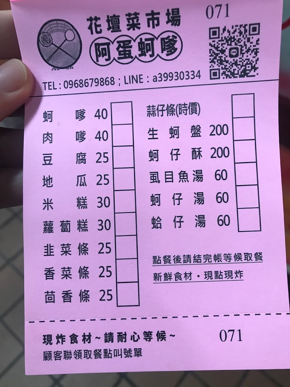 店址位在花壇市場內,很有名的阿來羊肉隔壁!我們是吃完了阿來羊肉,再來這兒買蚵嗲外帶,沒想到,出乎意料地好……好……吃哦!外皮炸得酥脆不會感到油膩,內餡實在,蚵仔飽滿大顆,咬下一口,韭菜和蚵仔的香氣撲鼻而來,人間美味!?