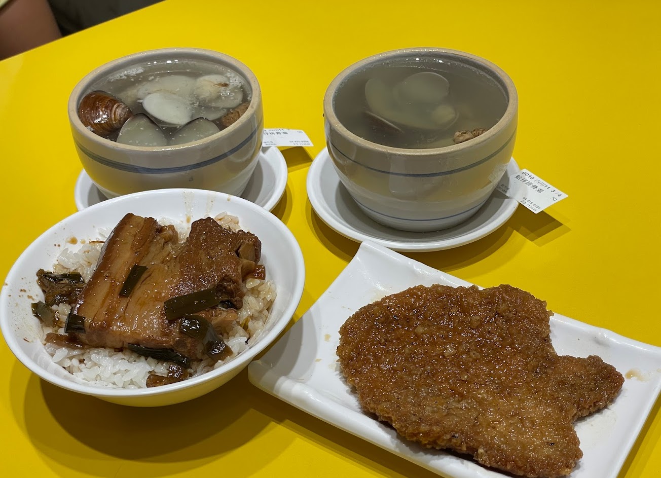 湯沒調味,滷排骨的裹粉口感很奇怪有個味道,淋在飯上的滷汁不香也沒鹹度,好像只剩蒜泥白肉能稱讚了,抹布不洗乾淨就來擦桌子,擦完桌子更髒= =”