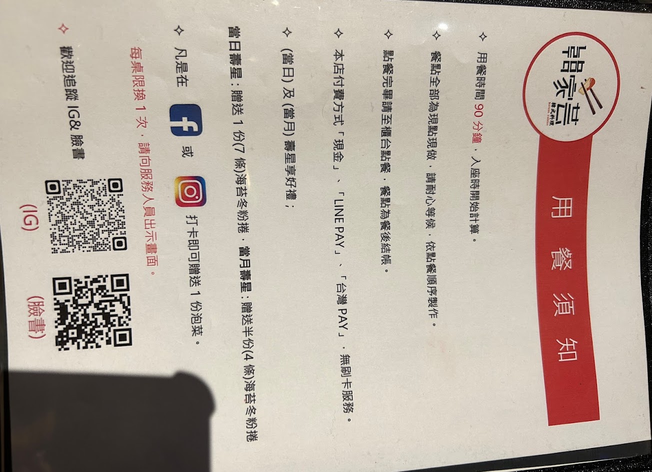 價格實惠,餐點還不錯,附近就是員林基督教醫院,周邊道路有停車格可以停車,但通常沒有位置,餐點附贈的米飯好吃不軟爛,服務人員態度良好,出餐速度感覺不快,餐點賣相非常好,光看盤面的菜色就覺得值回票價,海鮮煎餅的內餡多,但是蝦子的品質感覺較為一般,煎餅沒有馬上吃的話,餅皮會變得軟些,會影響口感,另外店家規定用餐時間90分鐘,是從落座後開始計算,雖然不至於用餐時間不夠,但總覺得要是店家出餐速度慢了點,那不就壓縮到客人用餐時間?建議用餐限定時間,應從店家出餐後開始計算。