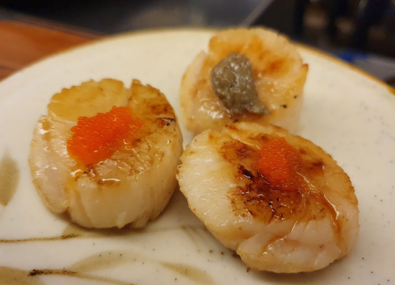 鴨肝干貝:生食級干貝熟度有一點超過,干貝本身很大顆直接填滿一個湯匙,但搭配鴨肝不出色。