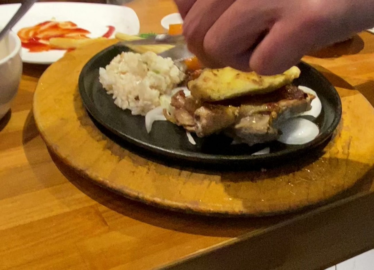 點了12盎司嫩肩沙朗七分熟,牛排還沒上桌前先來喝玉米濃湯跟羅宋湯,玉米濃湯還不錯,羅宋湯就一般,脆薯跟餐包上桌脆薯好吃,餐包還可以,主餐牛排上桌服務員會幫你先將牛排切開,讓你確認熟度,不錯的服務,但服務口氣讓我感覺有點不舒服,先吃配食,炒飯雖有粒粒分明但米心沒熟,店排第一的嫩肩沙朗牛排就一般般了,有點柴多筋。