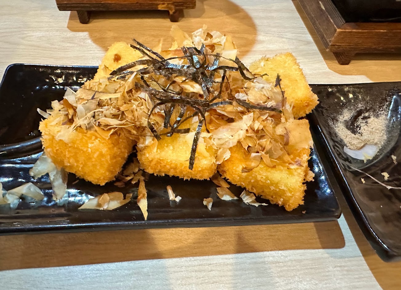 ? #沙朗牛排鍋膳 在外面較少見,使用道地日本醬汁融入炸牛排,加入雞蛋和烏龍麵,有點像在吃壽喜燒,烏龍麵吸附了湯汁但不會太鹹,滿推薦的,當天還加點 #棋盤炸豆腐 一份六塊,酥脆且灑上柴魚片沾上醬油好吃, #海景大阪燒 則吃得到真材實料的海鮮,不過因為美乃滋和麵粉皮偏厚吃到最後稍膩,又或者我們點太多了,定食套餐其實就很夠還加點真的太撐⋯?