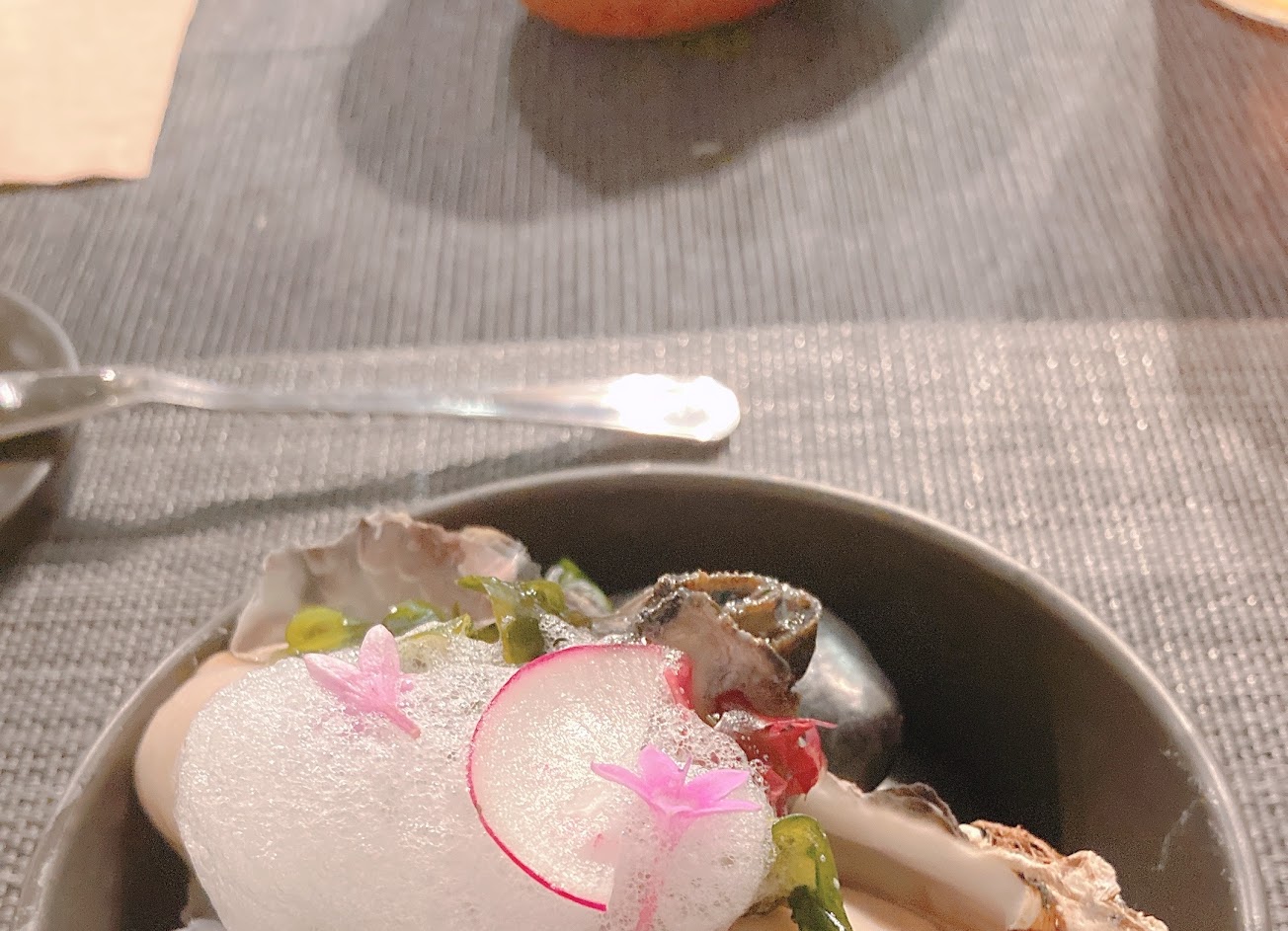 超大顆的廣島牡蠣!搭配海藻及柚子醬汁,非常肥美鮮甜!主廚用特殊的作法讓牡蠣不會軟軟爛爛的,不敢吃生蠔也一定會很喜歡!