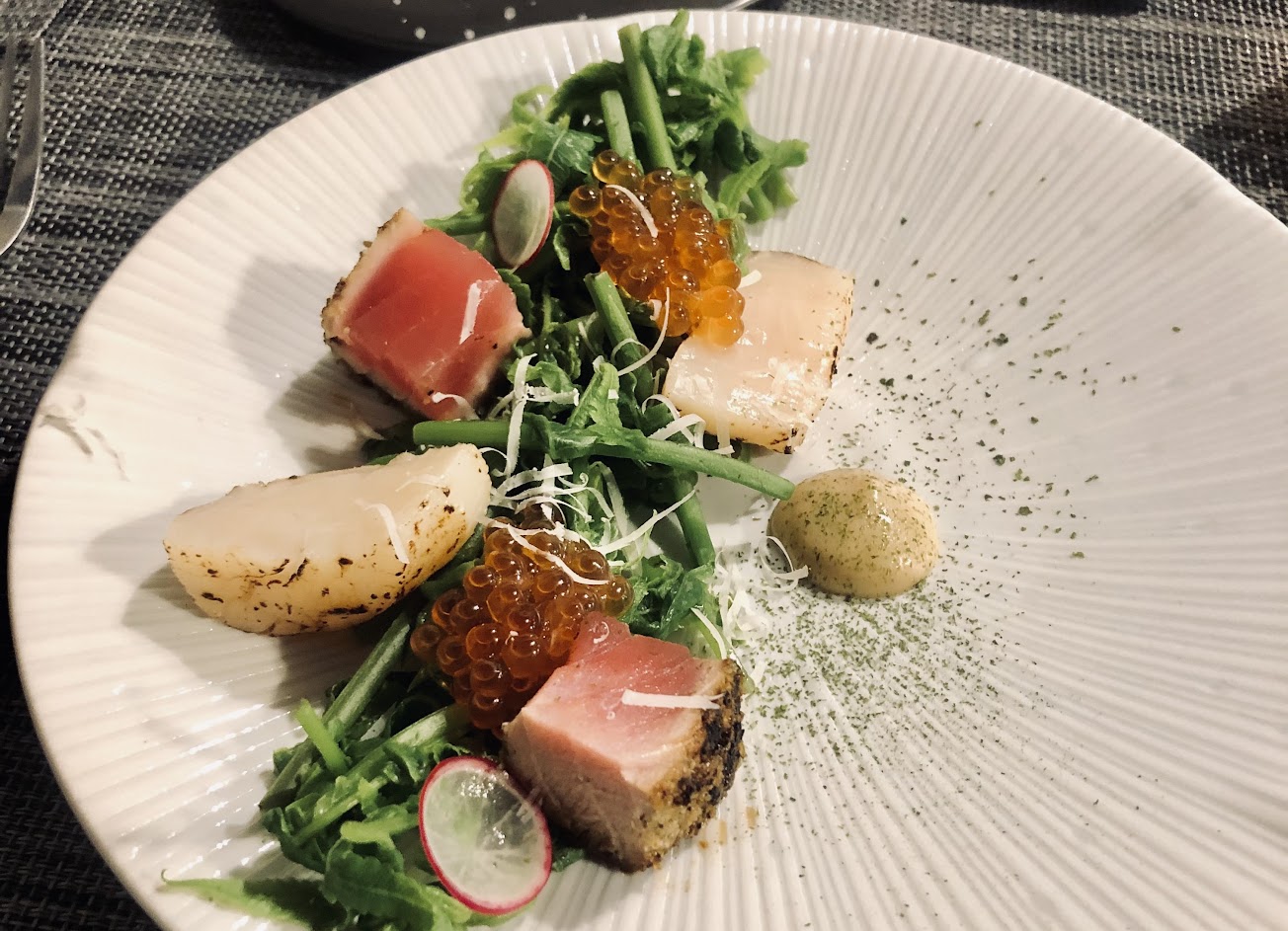 炙燒干貝跟鮪魚沙拉,蔬菜是山產過貓及山蘇,淋上鯷魚醬汁,很特別的是盤面上綠綠的粉是秋葵做的!