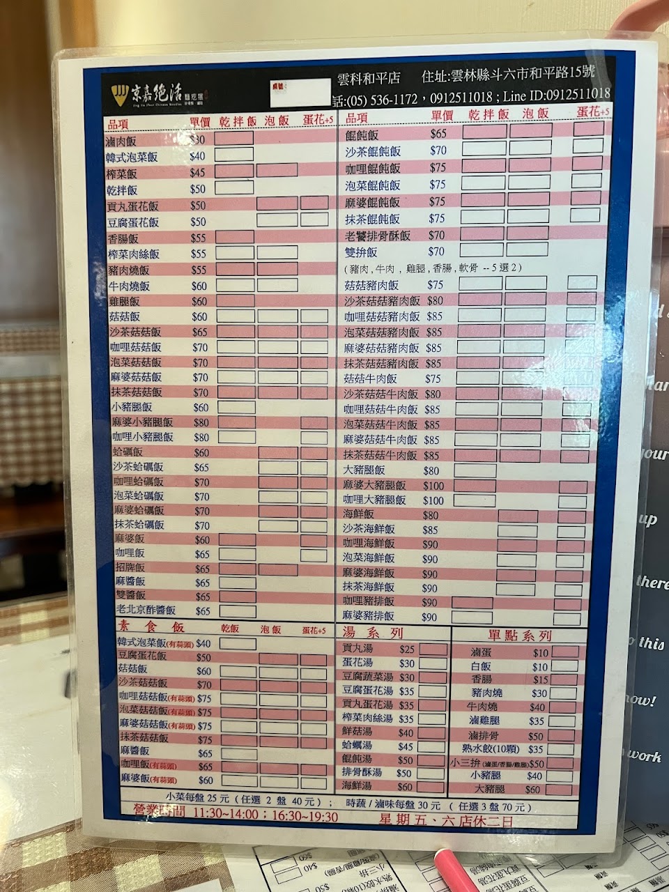 餐點樣式豐富琳瑯滿目,提供各種中式料理搭配,餐點主食可選擇要飯或者是麵,麵類又有多種如拉麵、疙瘩、王子麵或家常麵等等可選擇,其他還有單點小菜、湯類及飲品(有選擇障礙的人應該會很痛苦?)。