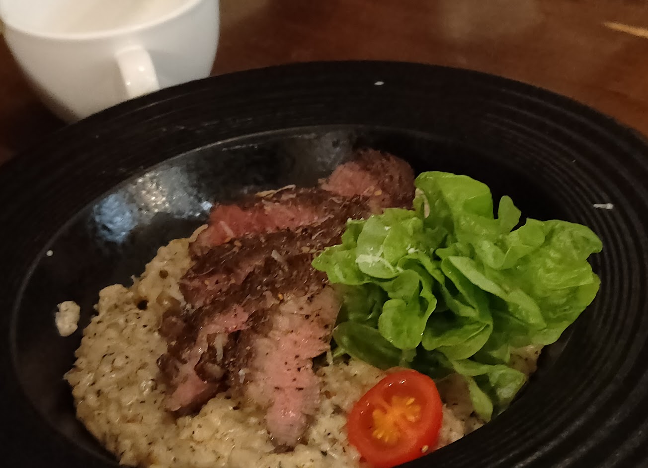 今天餐點是松露牛排燉飯,牛肉軟嫩適中,燉飯入味好吃