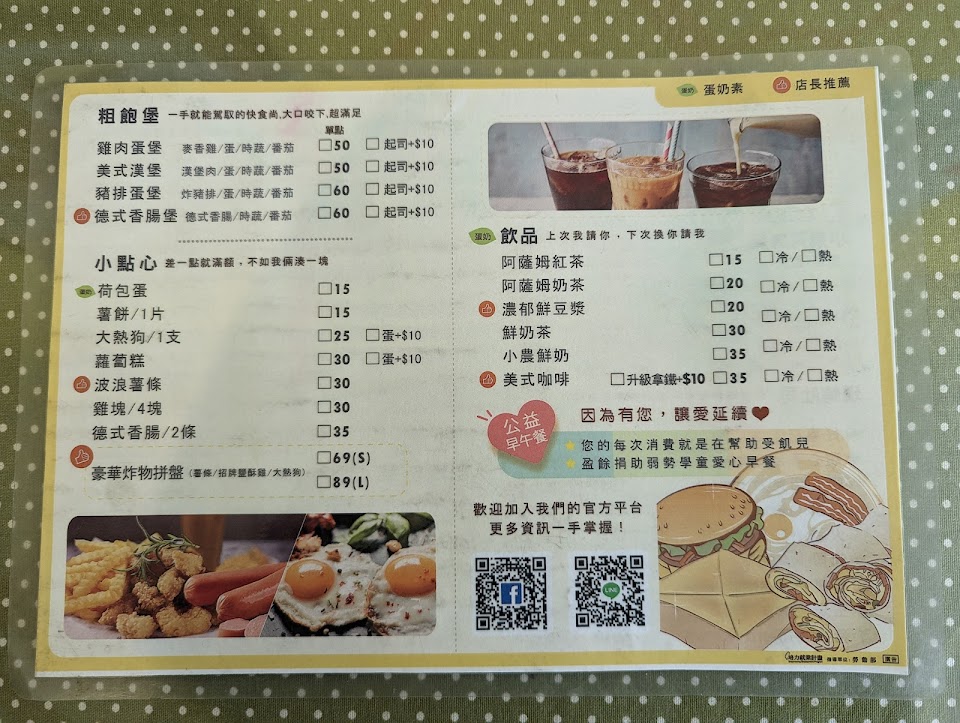 很有愛心的早餐店,但是餐點有待加強,厚片烤太焦,餐點也會做錯