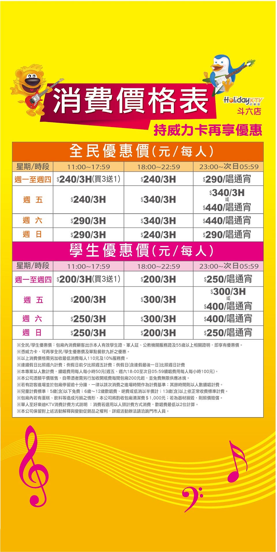 營業時間:, 各門市營業時間. 門市電話:, 05-532-8088. 門市地址:, 雲林縣斗六市西平路20號. 低消(人):, 無低消(VIP包廂低消$79/人). 計費方式:, 包廂計費