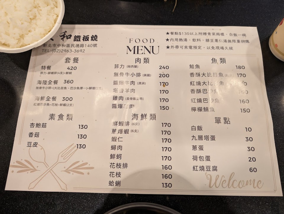 平價鐵板燒,附飲料跟兩種湯品(鹹湯、甜湯各一)無限享用,經濟實惠