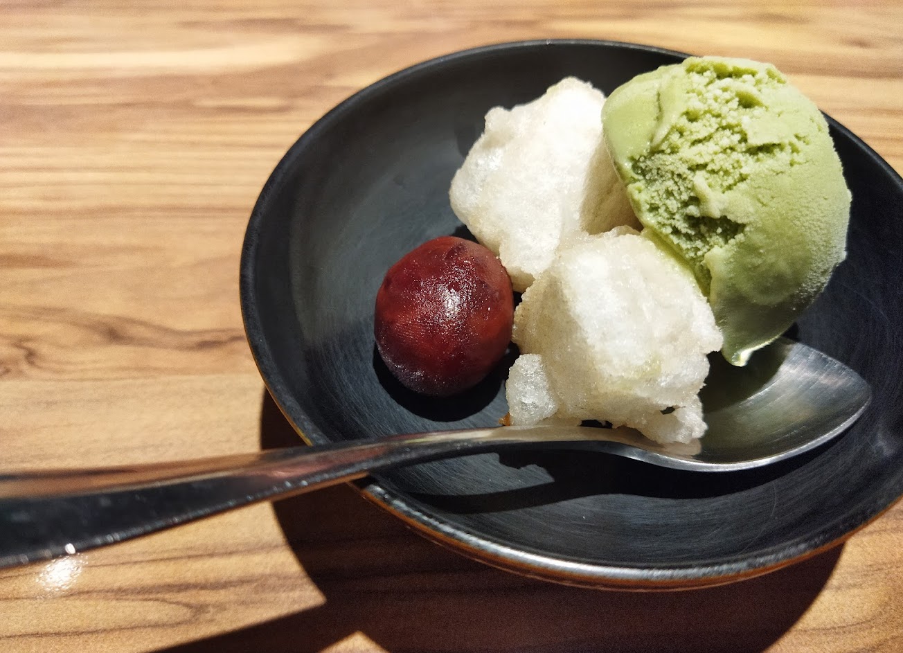 綠茶美人炸麻糬,餐後吃,外皮酥酥的,配著紅豆泥一起吃口感很棒,很圓潤的感受
