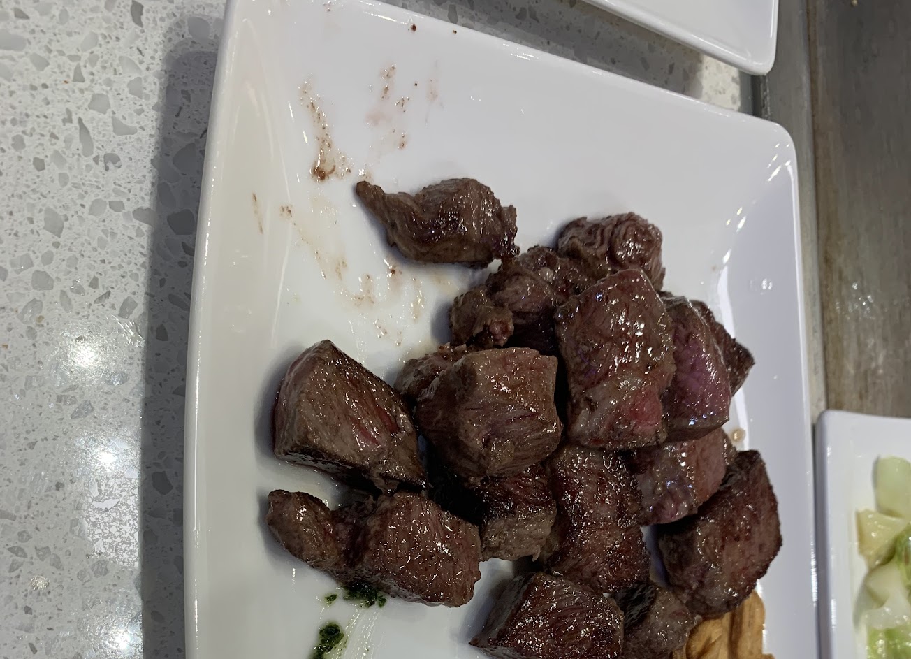 青菜炒大量份量不均 且出水嚴重 味道普遍偏淡 牛肉點5分來接近8分熟 有夠硬 愧對於這個價位 好險沒點1200雙人餐 不如大埔鐵板燒