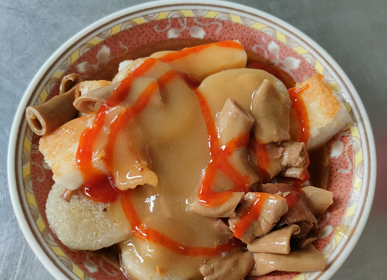 有大腸、煎粿、米腸及香腸,上頭淋上古早味的甜醬汁,味道很夠,整體偏甜~