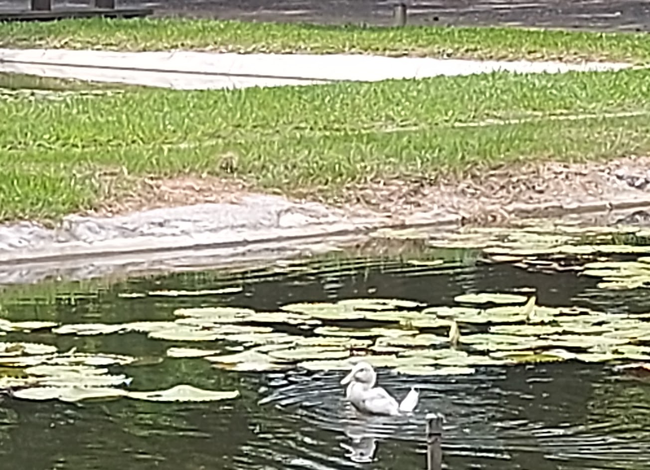 緩緩走來、心定氣閒,看水鴨、池魚、睡蓮悠悠哉哉。清風、輕撫著水面的波紋;陽光、照得粼粼波光。大王椰子在高處揮手,水塔靜靜的述說他的過往;榕樹、老得要靠入地的氣根為杖…。
