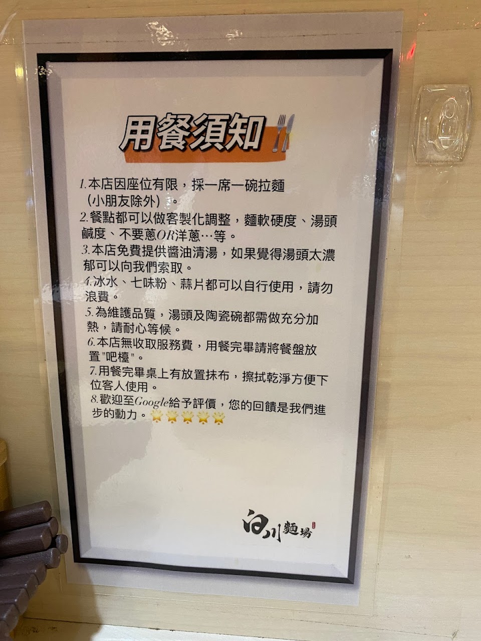 從室外就能看清楚一樓室內,少去推開店門的緊張感。空間小巧但有二樓,店內整潔明亮,人員親切客氣;座位間雖無甚距離,但置物籃、酒精、面紙、冰水、餐具、髮圈、蒜片、七味粉都在伸手可及之處,免去起身的尷尬。一人一席一張點餐單,基本消費一碗麵,湯頭鹹淡、麵條軟硬、配料增減都可以調整。就座後確認餐點再去櫃檯結帳,支援部分行動支付。