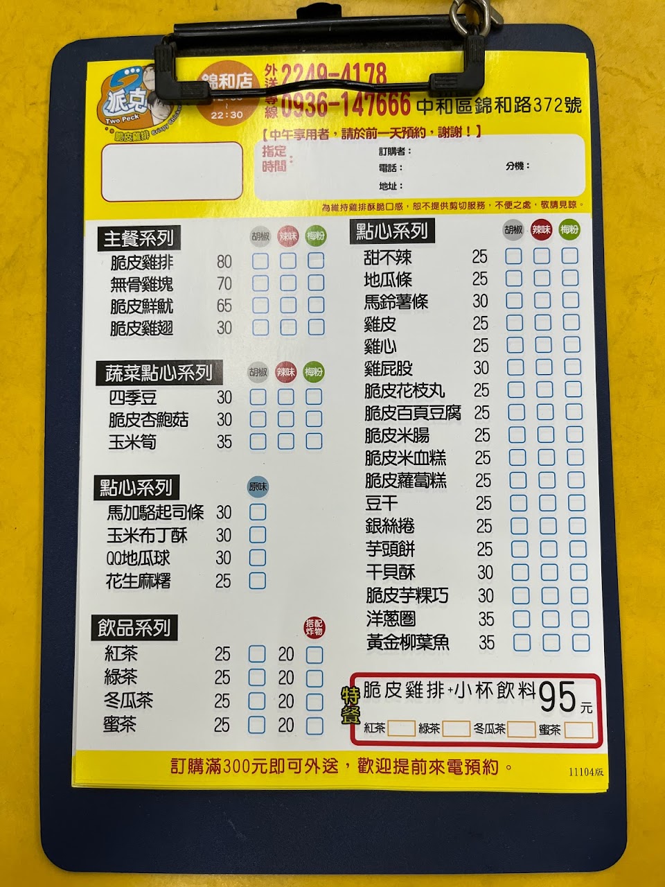 打電話訂女的態度很差,拜託不爽接電話就給男的接,一顆星給男的態度很好外送服務佳!中和區錦和路372號,22494178夠清楚嗎?